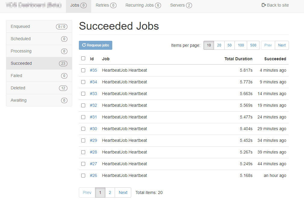 But I didn’t want to pollute the “Succeeded” page with these Heartbeat job entries, and I only care of those jobs related with the data sync. So, I needed to remove them from there. I started to do some research and I eventually found some solutions but they consisted in changing the Dashboard itself, which is something that I wanted to avoid.