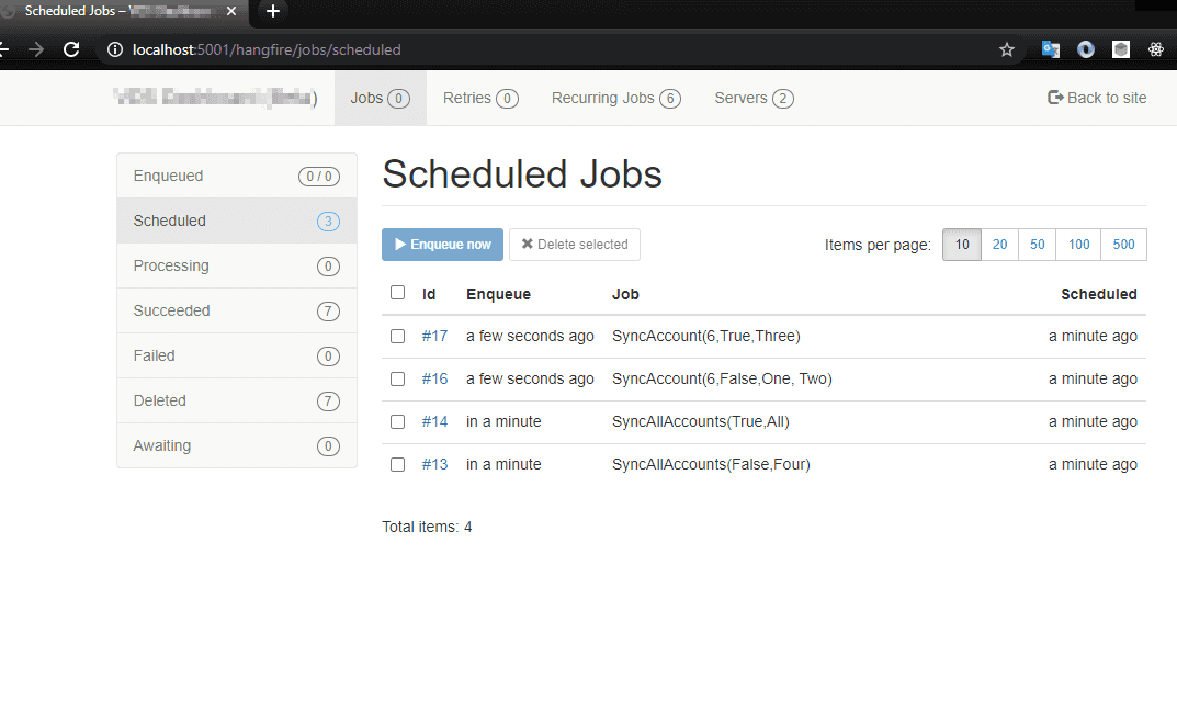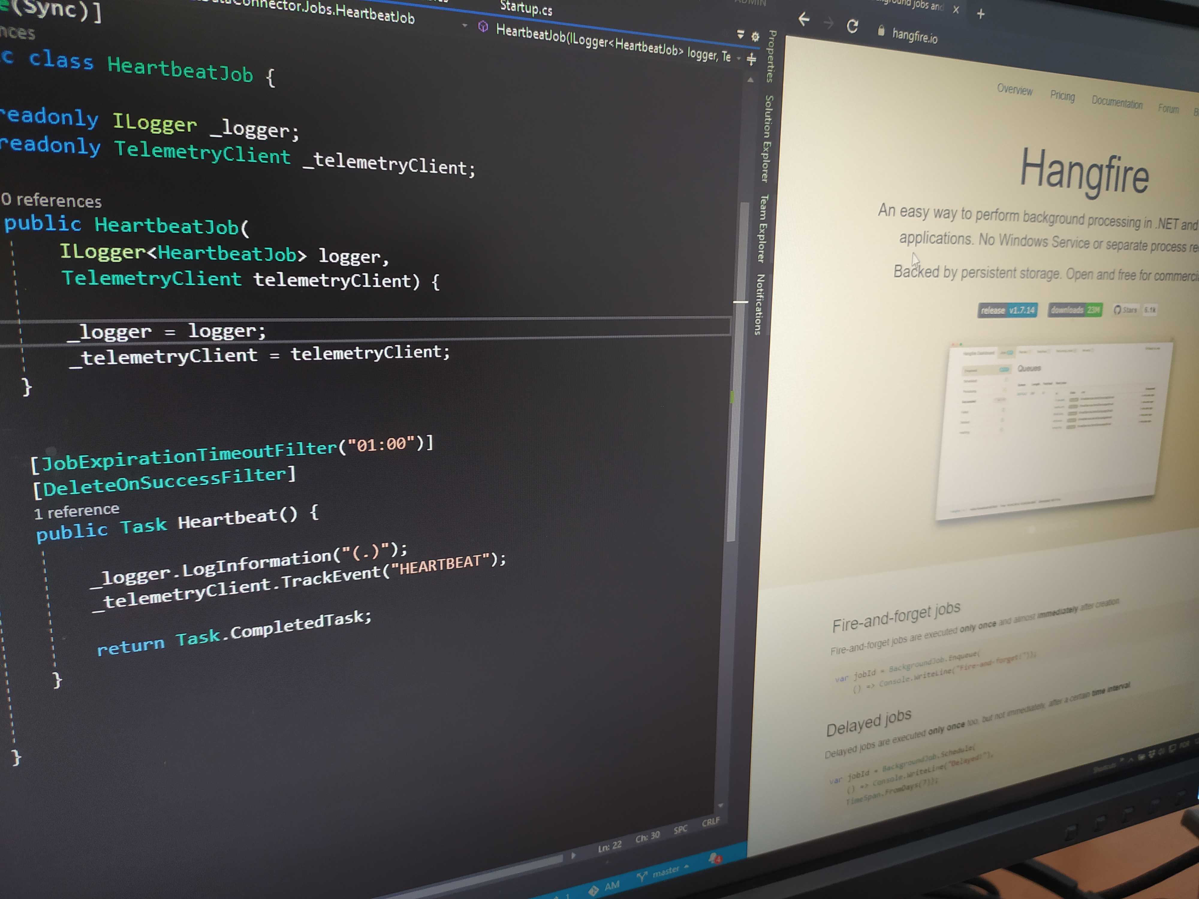 I used Hangfire as the processing background server hosted in a windows service with Topshelf. I won’t go in too much details about the architecture of this connector, but one of the requirements was that it must be reliable and resilient, so as soon as the job was created it should complete the task whenever possible, even if there are some transient errors. Hangfire provides a retry mechanism out of the box, so if an unhandled exception occurs during the job, Hangfire supports to configure a retry strategy to take care of it. I also used some other retries mechanisms before letting the exception to propagate to Hangfire, for example using Polly for HTTP retries.