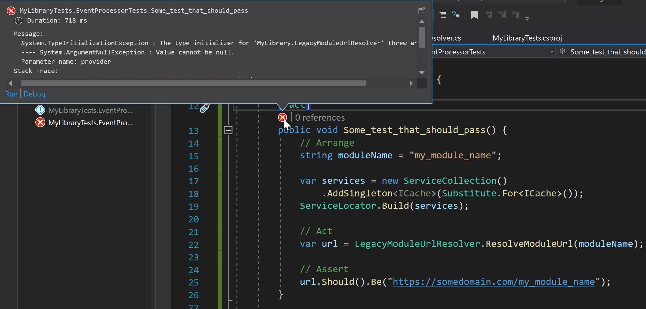 This was a simple explanation why the test was failing. In reality the test was much more complex, involving several assemblies provided by several nuget packages. One of the methods in the test was swallowing exceptions, so it was being completely silence, and the test was failing due an assert. This made the diagnostics even harder. Net-net, sometimes it’s good to have full control when things happen and to be lazy in initialization until we really need it.