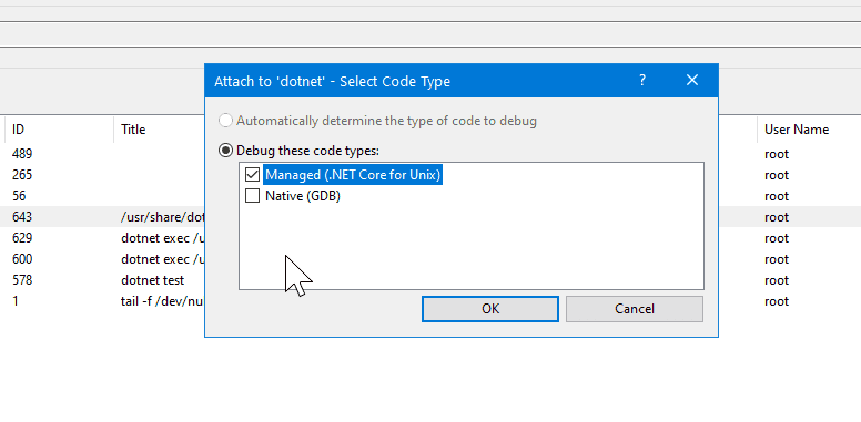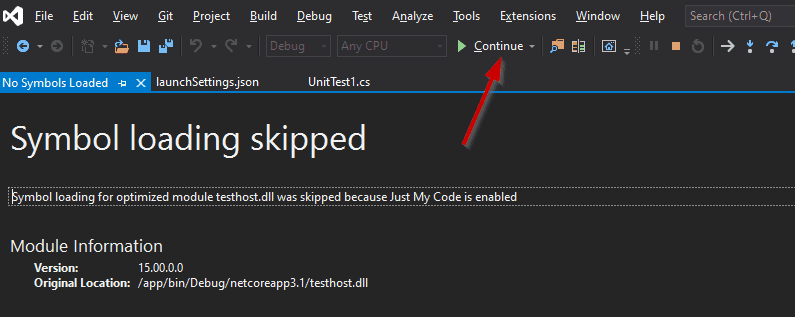 enabled. Please attach debugger to testhost process to continue. Process Id: 643, Name: dotnet_
