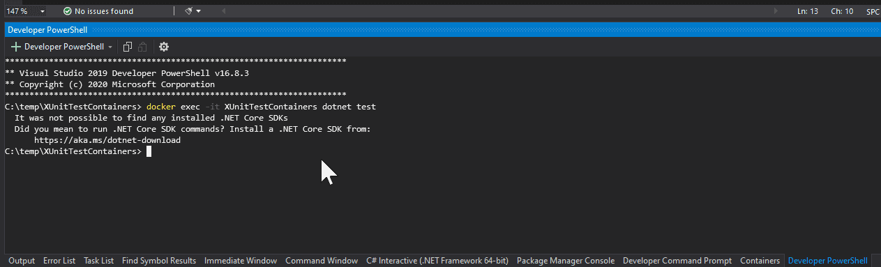 docker exec -it <name_of_the_container> dotnet testLet’s see what happens.