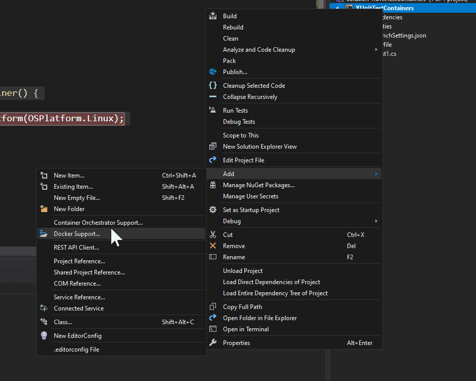 }Unlike ASP.NET projects, in Unit Test projects we don’t have the option “Enable Docker Support” while creating the project. Though, the option is still available via Solution Explorer. Let’s try it.