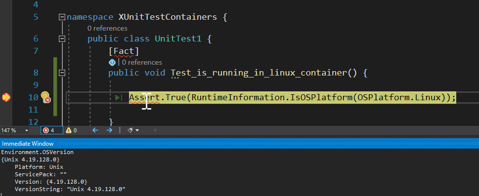 For demonstrating purposes, let’s create a simple test that asserts that the test is running in a Linux container.