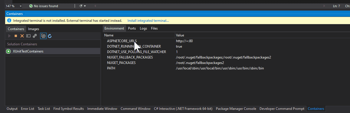 My expectation was that the experience of running or debugging unit tests in containers would be exactly the same as ASP.NET or Console apps. I was even expecting that I could use the VS Test Explorer: as long as the Docker launch profile was selected, I thought that the tests would be running/debugging inside the container. Unfortunately it’s not the case.